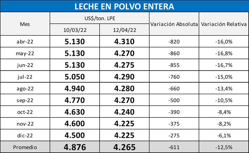 Mercado de Futuros NZX – Leche en Polvo Entera 13/4/2022