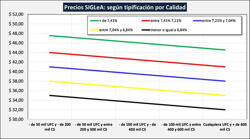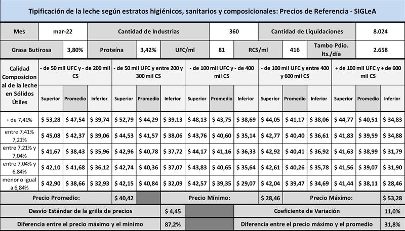En el cuadro de tipificación, la leche comercializada se divide en 25 estratos según composición y calidad higiénico-sanitaria y, dentro de cada estrato, se muestra un promedio ponderado del precio del total de esos litros y además un promedio ponderado del 20% superior e inferior de los precios.