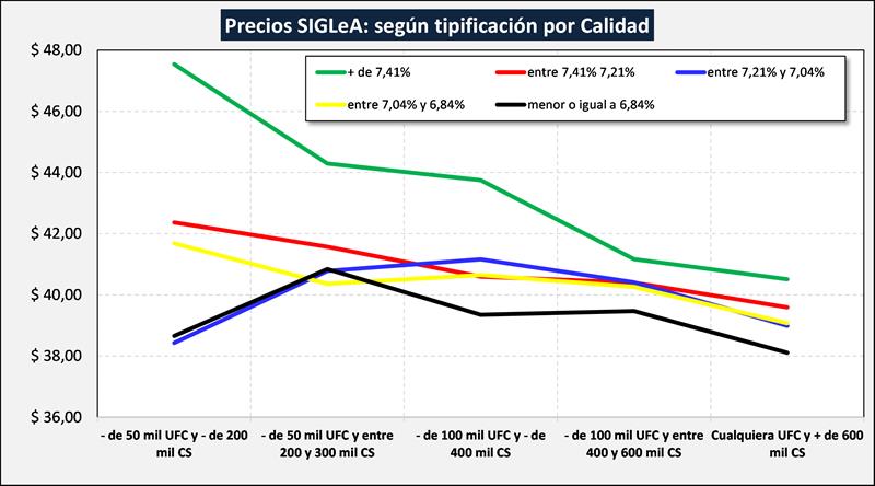 En el gráfico de arriba se presentan en 5 curvas por Tipo de leche en función a los sólidos útiles (grasa butirosa + proteína), los diferentes precios en función a la calidad higiénico-sanitaria (UFC/ml y RCS/ml). Se puede observar que existen precios descendentes en cada tipo composicional a medida que desmejora la calidad higiénico-sanitaria, pero se dan serruchos ya que las “penalizaciones” por menor calidad se ven compensadas seguramente por la presencia de bonificaciones comerciales que pueden estar especificadas y tabuladas (ejemplo: volumen, temperatura, distancia, permanencia, etc.) o arbitrarias en función a aspectos no especificados en los Sistemas de Tipificación y Pago de la Leche (netamente comerciales).