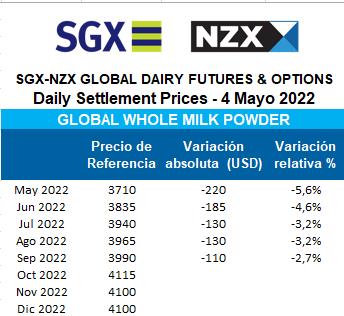 Mercado de Futuros NZX – Leche en Polvo Entera 5/5/2022