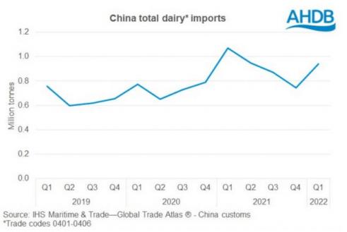 Durante el primer trimestre de 2022, las importaciones chinas de productos lácteos (fundamentalmente polvo y concentrados) llegaron a 940.000 t. Han subido con respecto a las del último trimestre de 2021 en un 12%, lo que podría parecer una mejoría en las compras chinas, pero no es así. China concentra la mayor parte de sus importaciones de lácteos en el primer trimestre de cada año, por lo que no es raro que sean mayores que las de finales del año anterior. No obstante, las de este año son una cifra peor que las de hace un año, ya que son un 26% más bajas, aunque siguen en un buen nivel y por encima de las del primer trimestre de 2020 y 2019, como puede verse en el gráfico adjunto:
