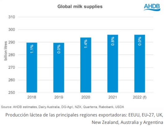 No obstante, para la AHDB, el impacto real en los precios dependerá del equilibrio entre la producción de leche en 2022 (que se prevé se mantenga sin aumentos o incluso baje, tras el incremento del 0,8% de 2021) y el grado en que China reduzca sus importaciones. En el gráfico adjunto puede verse la evolución de la producción.