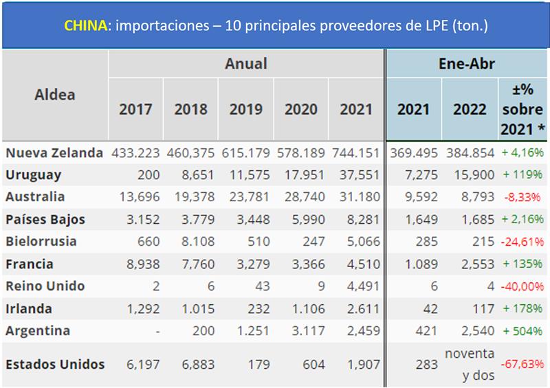 China es el principal importador de Leche en Polvo Entera y su principal proveedor es Nueva Zelanda quien ostenta el 92% de participación de ese producto en el gigante asiático, en el período enero-abril de 2022.