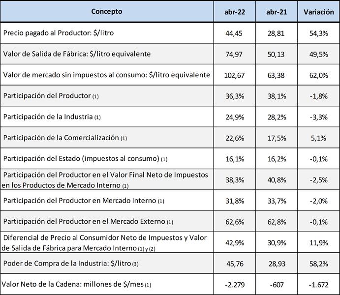 La cadena presenta un resultado negativo en abril 2022 de $ 2.280 millones (2,4 centavos de dólar por litro de leche equivalente). El sector industrial tiene un resultado estimado positivo de $ 1.271 millones y quien lleva una pérdida significativa es el sector primario con $ 3.552 millones (unos $ 4,24/litro de leche), lo que indicaría un precio de equilibrio necesario entre $ 49 y $ 50/litro para cubrir todos los costos operativos y el costo de oportunidad del capital.