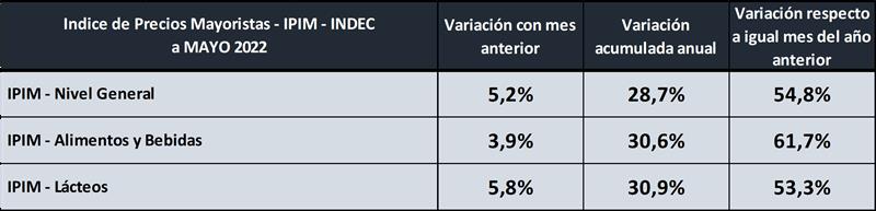 Índice de Precios Internos Mayoristas – IPIM – Lácteos – mayo 2022 16/6/2022