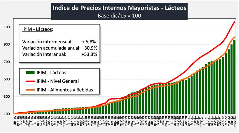 El índice mayorista de precios de los Lácteos registró un aumento de 5,8% en mayo de 2022 respecto del mes anterior, 30,9% en el período enero-mayo y acumula una suba del 53,3% en los últimos 12 meses.