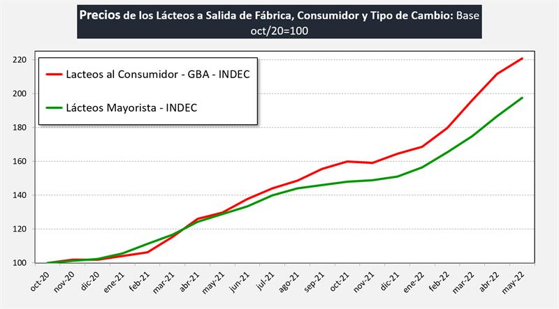 Si los comparamos con los precios de los lácteos del índice de precios minoristas (con datos de GBA ya que no hay un índice lácteo minorista nacional), que presentaron a mayo de 2022 una suba interanual del 64%, están 11 puntos porcentuales por debajo. Y si lo hacemos con los precios de la Ciudad Autónoma de Bs. As., la diferencia es similar a GBA, siempre en favor de los precios minoristas.