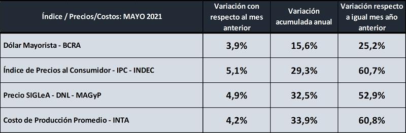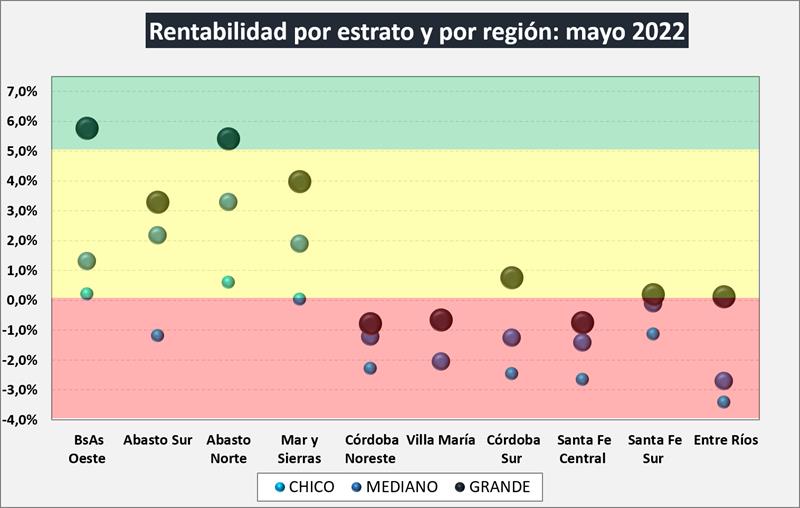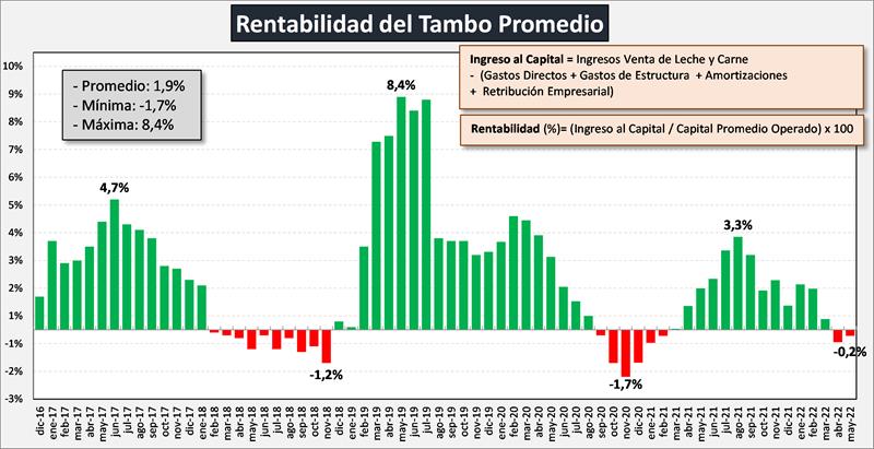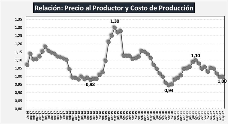 Desde marzo de 2021 el precio al productor (aunque con altibajos) superó al costo de producción de leche (relación superior a 1), pero en ningún momento alcanzó al precio de equilibrio, que exige una rentabilidad sobre el capital operado del 5% anual, ya que la rentabilidad promedio de ese período fue del 1,6% con extremos entre -0,5% y 3,3%. En mayo el costo prácticamente iguala al precio percibido y genera una tasa de rentabilidad levemente negativa (-0,2%) y una relación 1 a 1 respecto al precio.