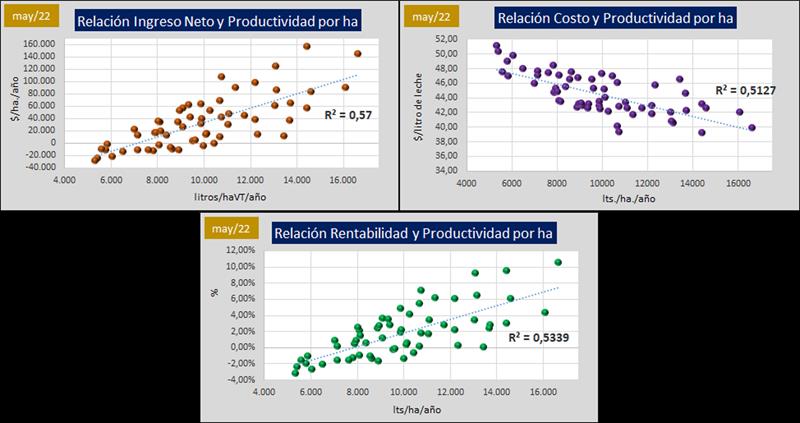 El Ingreso Neto, el Costo de Producción y la Rentabilidad tienen una vinculación muy fuerte con la Productividad medida en litros de leche producidos por hectárea y por año como puede visualizarse en los gráficos siguientes.