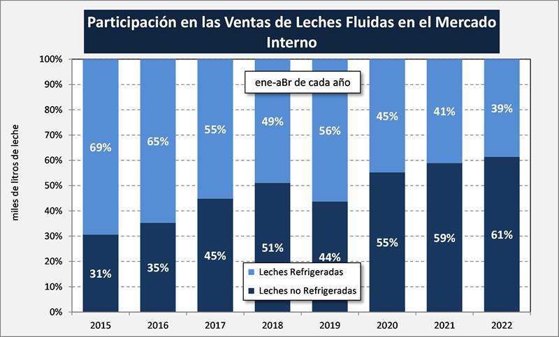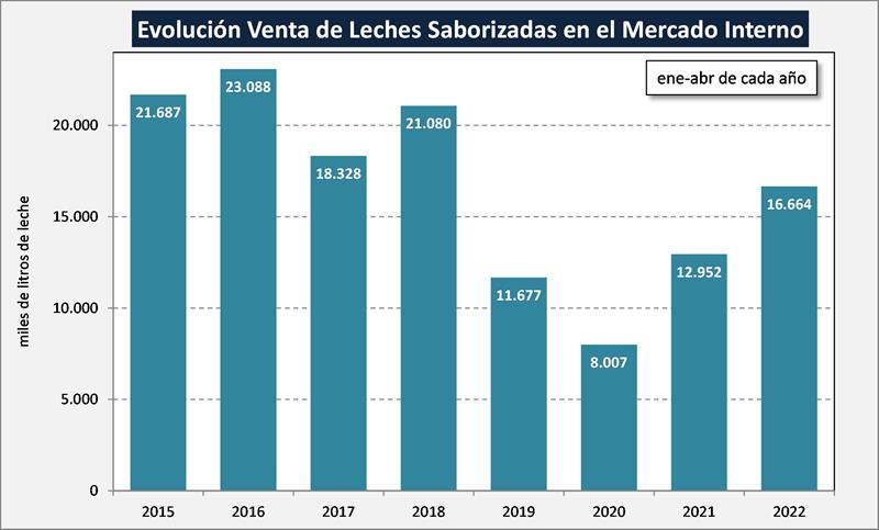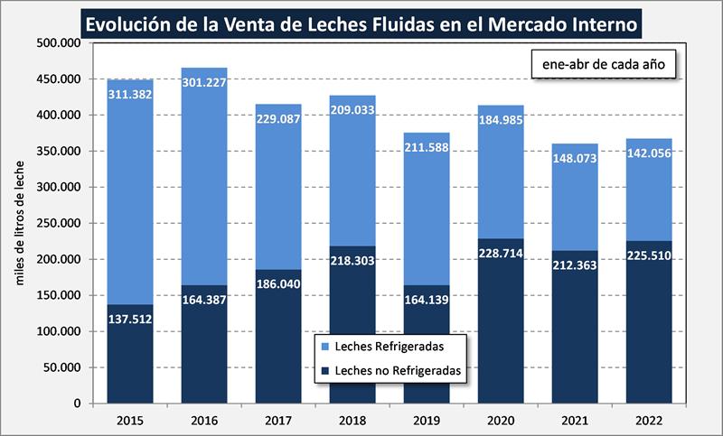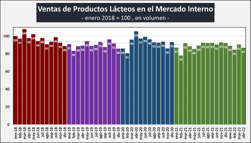 Esto indica una caída en las ventas de lácteos en supermercado y autoservicios mayoristas en lo que va de 2022, del 10 y 15% respectivamente, o un mix de ventas de menor valor unitario promedio (consumo más primario y de menor valor agregado).