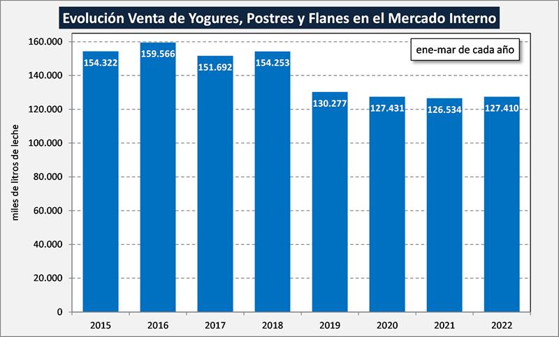 Por otra parte, en el gráfico de abajo se ve cómo productos como las leches saborizadas o chocolatadas, que presentaron una muy alta tasa de crecimiento en ene-abr 2022 (28,7%), es sólo por efecto de comparar con años muy bajos, donde las ventas fueron extremadamente bajas, ya que se continúa con la tendencia de caída de esta categoría. Situación muy similar presentan en el gráfico que le sigue, los yogures, postres y flanes.