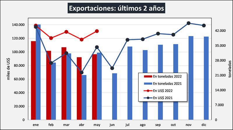 Como puede verse en el gráfico de más abajo, las exportaciones de inicios de 2022 fueron bastante inferiores a 2021, pero cabe aclarar que las exportaciones de enero 2021 fueron muy elevadas ya que acumularon las exportaciones no realizadas a Brasil de diciembre 2020 que tuvieron dificultades de ingreso “por cuestiones burocráticas de ese país de destino”. Y en febrero se da una situación inversa, normales exportaciones en 2022 comparada con bajas exportaciones de febrero 2021 por los altos volúmenes del mes previo. En los meses de marzo y abril de este año también se dio un incremento significativo interanual en las exportaciones en volumen (menores dificultades logísticas) y obviamente en valor por el aumento de los precios internacionales. Para el mes de mayo se observa una normalización en volumen y se mantiene un diferencial importante en valor producto de los mejores precios.