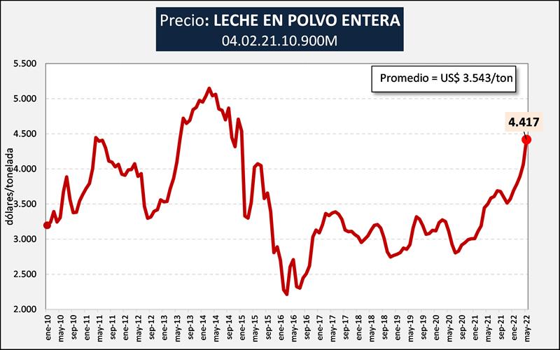 El precio medio de exportación por tonelada fue de US$ 3.883 para los cinco primeros meses del año, lo que implica un incremento del 22,2% respecto a 2021. En el caso particular del rubro Leches en Polvo, el precio promedio fue de US$ 3.878/ton., un 22,6% por encima del igual período del año anterior.