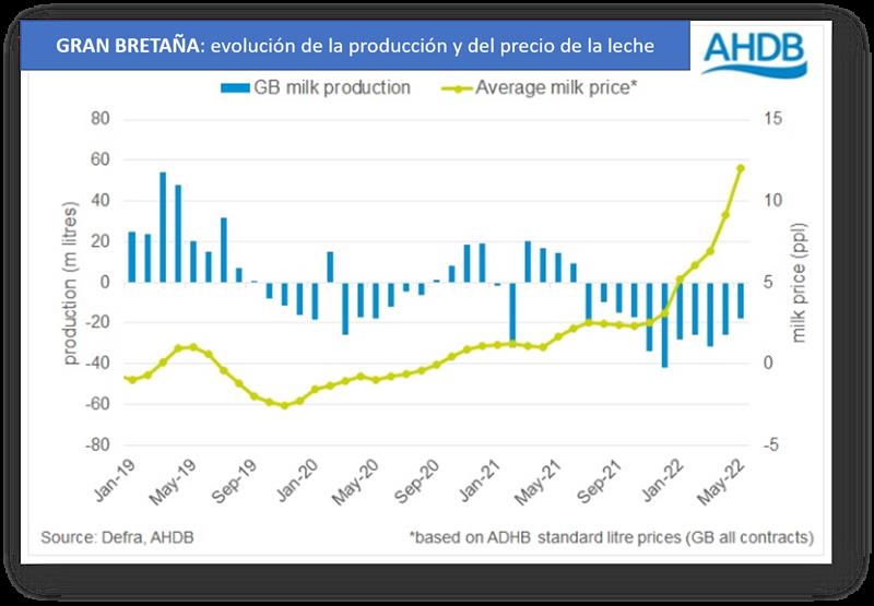 La producción de leche generalmente responde positivamente a los precios más altos de la leche en la granja, suponiendo que los costos de producción permanezcan relativamente estables. Sin embargo, con el rápido aumento en la inflación de los costos de los insumos desde el verano de 2021, la producción de leche de GB se ha quedado atrás con respecto a los niveles del año anterior.