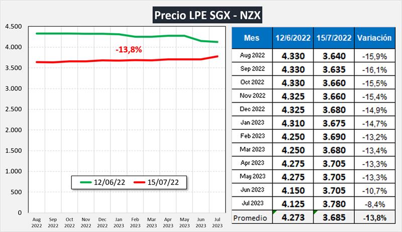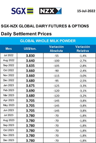 Mercado de Futuros NZX – Leche en Polvo Entera 18/7/2022El precio de la Leche en Polvo Entera experimentó una fuerte baja el viernes próximo pasado en el Mercado de Futuros SGX - NZX, lo cual consolida un descenso que se viene dando en los últimos 35 días como puede observarse en el segundo gráfico/cuadro. Hay que estar atentos a las cotizaciones de mañana del Global Dairy Trade (GDT) para ver si estas bajas repercuten en el mercado disponible. ![]() ![]() elaborado por el OCLA con información del SGX - NZX