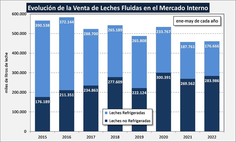 En los dos gráficos siguientes se presentan las ventas (en miles de litros) de enero-mayo de cada año de leche fluida (refrigeradas y no refrigeradas), donde se puede ver por un lado el descenso generalizado en la venta de leches fluidas (al menos las que captura la Resolución 230), con una muy leve recuperación este año luego de la fuerte caída del año pasado y además como van creciendo en participación las leches no refrigeradas en detrimento de las leches refrigeradas.