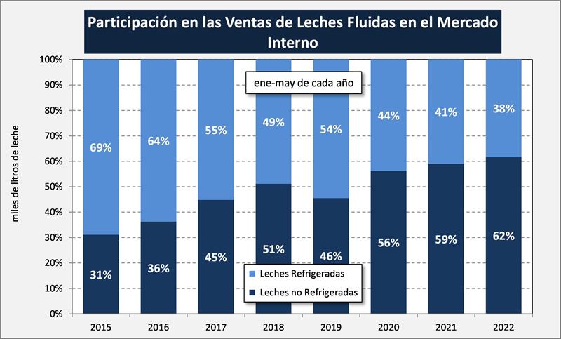 Esto indica una caída en las ventas de lácteos en supermercado y autoservicios mayoristas en el mes de mayo de 2022, del 13 a 16% puntos porcentuales, y/o un mix de ventas de menor valor unitario promedio (consumo más primario y de menor valor agregado).