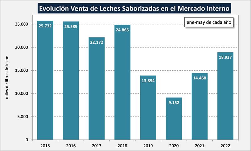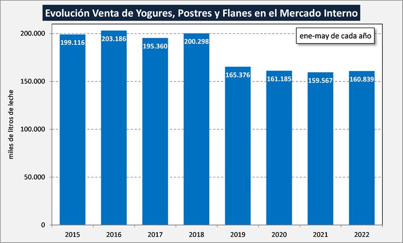 Por otra parte, en el gráfico de abajo se ve cómo productos como las leches saborizadas o chocolatadas, que presentaron una muy alta tasa de crecimiento en ene-may 2022 (30,9%), es sólo por efecto de comparar con un año muy bajo, donde las ventas fueron extremadamente bajas, ya que se continúa con la tendencia de caída de esta categoría. Situación muy similar presenta el gráfico que le sigue de yogures, postres y flanes.