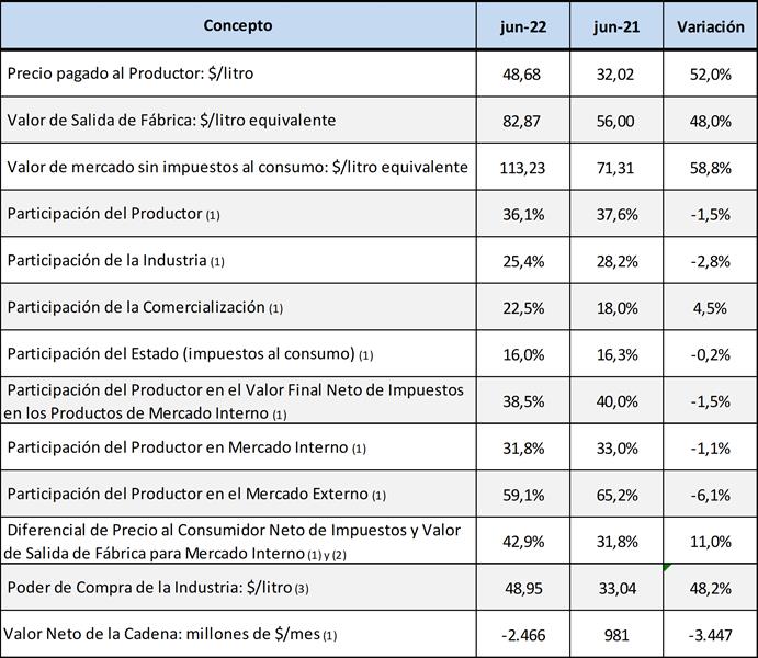 La cadena presenta un resultado negativo en junio 2022 de $ 2.466 millones (2,20 centavos de dólar por litro de leche equivalente). El sector industrial tiene un resultado estimado positivo de $ 260 millones y quien lleva una pérdida significativa es el sector primario con $ 2.725 millones (unos $ 3/litro de leche), lo que indicaría un precio de equilibrio necesario entre $ 51 y $ 52/litro para cubrir todos los costos operativos y el costo de oportunidad del capital.