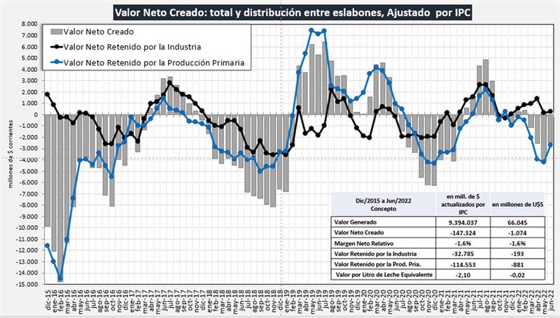 El gráfico siguiente muestra los resultados sectoriales actualizados por IPC y en el cuadro se puede ver claramente qué en estos últimos casi 7 años, la cadena no retuvo del valor que generó, $ 2,10 o US$ 0,02 por litro de leche equivalente, perdiendo esa mayor diferencia el sector primario respecto al industrial (82/18).
