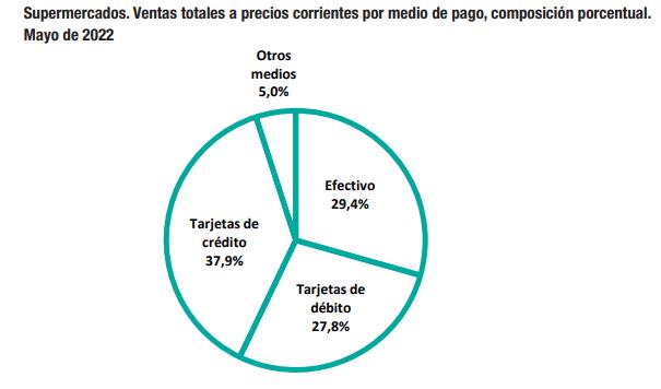 Los medios de pago utilizados por los clientes de los supermercados se componen con un 37,9% de tarjeta de crédito, 29,4% en efectivo, 27,8% con tarjeta de débito y el restante 5,0% con otros medios.