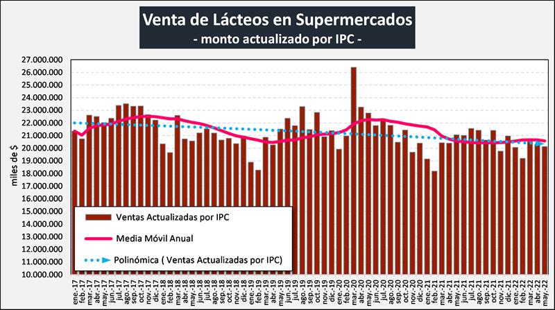 Ventas de lácteos en supermercados: $ 20.121 millones, +4,2% respecto al mes anterior, +53,4% respecto a igual mes del año 2021 y una disminución del 4,4% en las ventas actualizadas por IPC respecto a igual mes del año anterior.