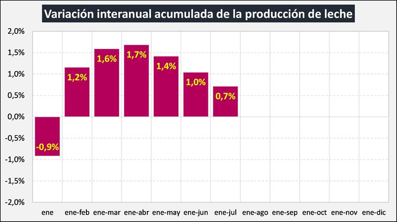 Abajo se puede ver la evolución de los denominados “sólidos útiles” (grasa butirosa y proteína), que subieron el 2,5% en enero-julio 2022, mas del triple del crecimiento de la producción medida en litros de leche (+0,7%).