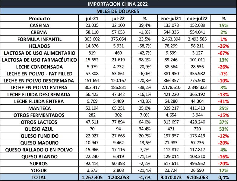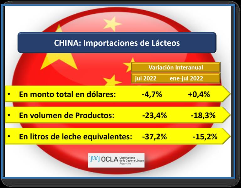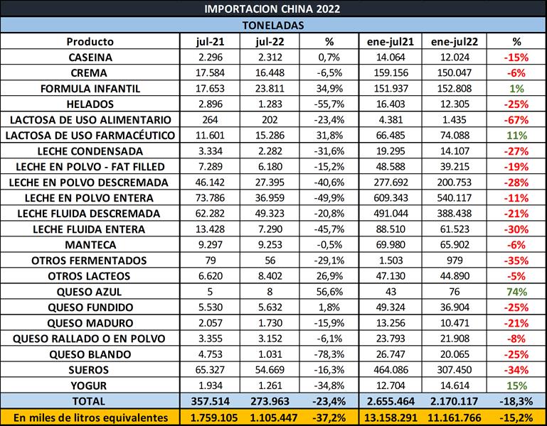 En el mes de julio próximo pasado el volumen de productos lácteos importados por China tuvo una baja del 23,4%, 37,2% en litros de leche equivalentes y 4,7% en el monto total en dólares, según el dato obtenido de Aduanas de China.