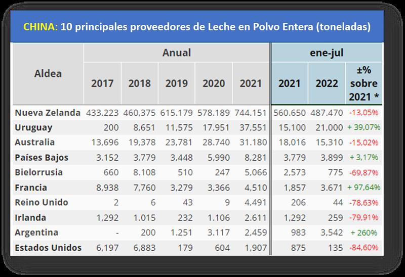 China es el principal importador de Leche en Polvo Entera y su principal proveedor es Nueva Zelanda quien ostenta el 90% de participación de ese producto en el gigante asiático, en los primeros siete meses de 2022 (92% en 2021).