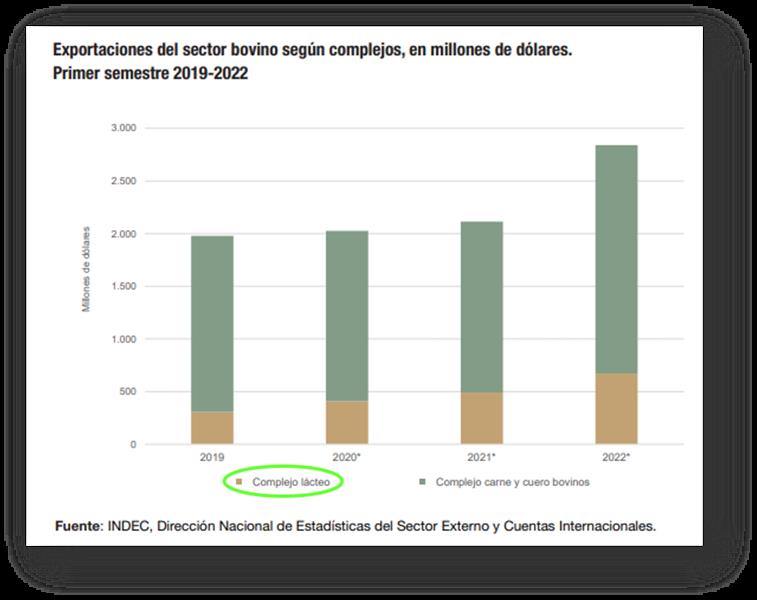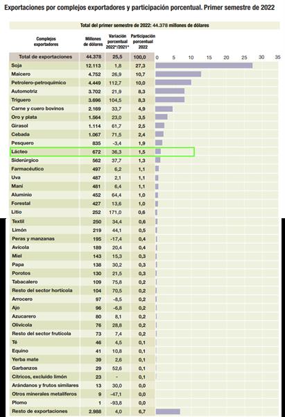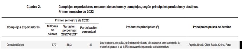 Las exportaciones del complejo lácteo en el período analizado fueron de 672 millones de dólares (1,5% de las exportaciones totales) y aumentaron 36,3% respecto al primer semestre de 2021. Se destacaron las exportaciones de leche entera, en polvo; mozzarella; queso de pasta semidura; lactosuero; y manteca. Los principales mercados fueron “Magreb y Egipto” (245 millones de dólares), Mercosur (137 millones de dólares, con una participación de Brasil del 86,1%), Chile (68 millones de dólares), CEI (45 millones de dólares) y “Resto de ALADI” (42 millones de dólares).