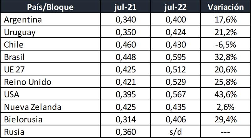 Precios de Leche Cruda en los principales Países/Bloques 7/9/2022