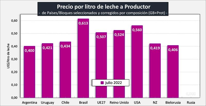Observaciones: los precios en el gráfico de arriba han sido corregidos sólo por sólidos útiles (grasa butirosa y proteína) y no por el resto de componentes que hacen a la calidad higiénica y sanitaria, ni tampoco por tipo de cambio real bilateral con cada uno de esos países/bloques.