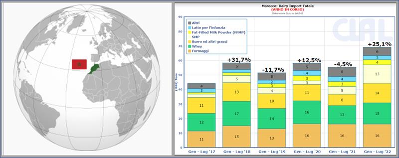 Las importaciones de Marruecos aumentaron un 25% en volumen entre enero y julio de 2022 respecto al mismo periodo de 2021. El producto que registró el aumento más importante es la leche en polvo descremada (LPD) cuyos volúmenes importados se han más que duplicado. El 90% del producto es suministrado por la Unión Europea, en particular Francia, Polonia y Bélgica, a pesar de los precios más altos en comparación con otras áreas de producción, favorecidas por la proximidad geográfica.