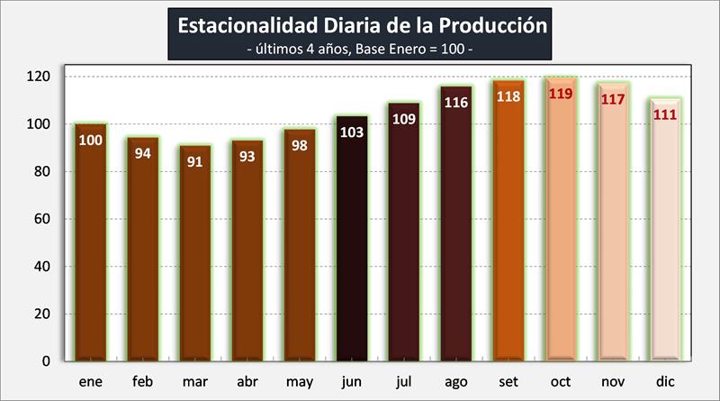 Como es habitual, la producción desde el pico de máxima en octubre, cae a una tasa del 5% mensual hasta marzo/abril (tomando el promedio diario de producción, para que no afecten la cantidad de días de cada mes), donde luego comienza un nuevo repunte hacia octubre.