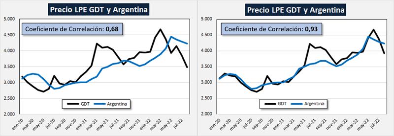 Para aclarar gráficamente esta aseveración, se compara el precio de la LPE de Argentina y del GDT, donde puede verse en el gráfico de la derecha, qué si corremos los precios del GDT hacia adelante 3 meses, las curvas coinciden plenamente (coeficiente de correlación pasa de 0,68 a 0,93), salvo en este análisis el período marzo-junio 2021 donde los precios de NZ fueron muy altos particularmente por las compras de China (93% de sus compras son a NZ).