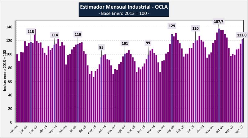 El EMI-OCLA asciende a 122,0 en agosto de 2022, valor 5,5% superior al mes anterior y baja 11,4% respecto a igual mes del año anterior.
