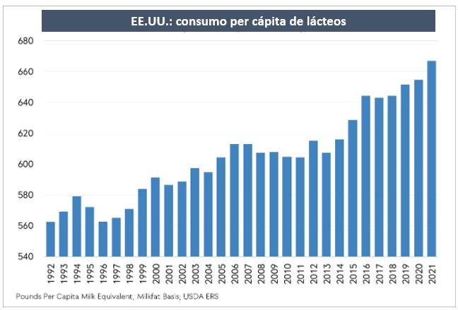 Solo en la última década: el consumo interno per cápita de queso aumentó un 13%; el consumo de manteca per cápita aumentó un 18%; el consumo de yogur per cápita aumentó un 2%. En general, los datos muestran que el consumo per cápita de productos lácteos estadounidenses en todos los productos aumenta constantemente cada año, con un aumento del 4 % en 2021 en los últimos cinco años, del 9 % en los últimos 15 años y del 19 % en los últimos 30 años.