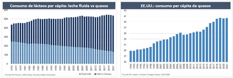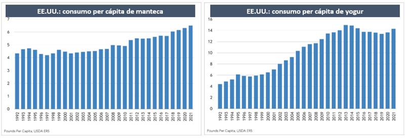 Los gráficos a continuación ilustran el crecimiento constante en el consumo per cápita de productos lácteos (expresados en libras).