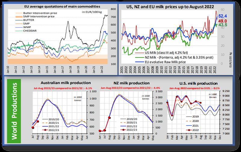 - En comparación con agosto de 2021, la producción de leche de EE. UU. en agosto de 2022 aumentó (+1,6 %), disminuyó en Nueva Zelanda (-4,9 %) y Australia (-5,3 %).
