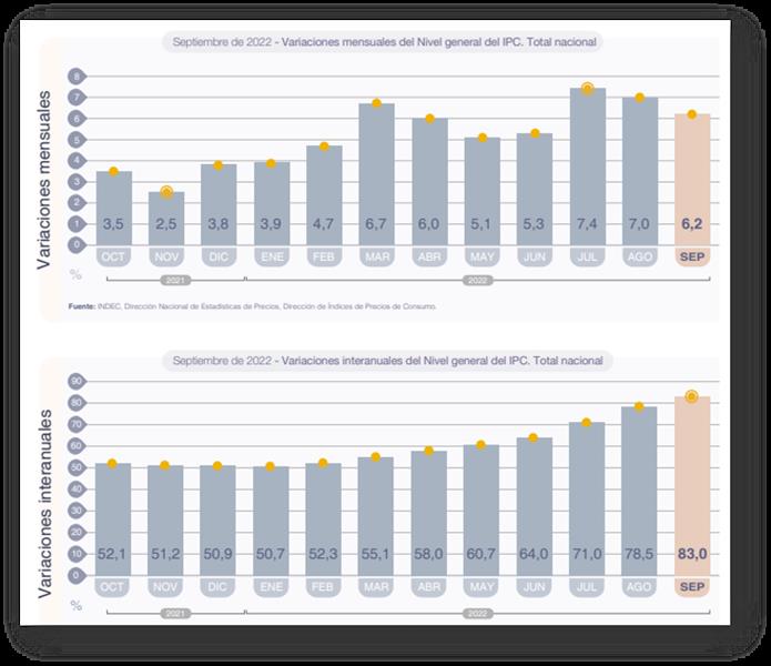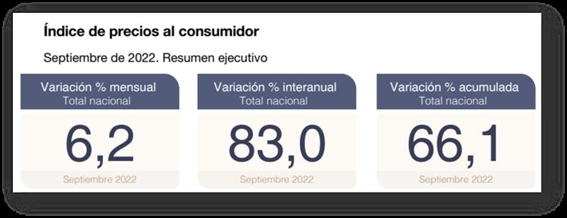 El nivel general del Índice de precios al consumidor (IPC) representativo del total de hogares del país registró en septiembre una variación de 6,2% con relación al mes anterior, 66,1% en los nueve meses transcurridos del año y del 83,0% en el interanual.