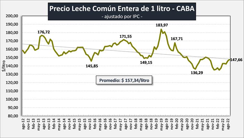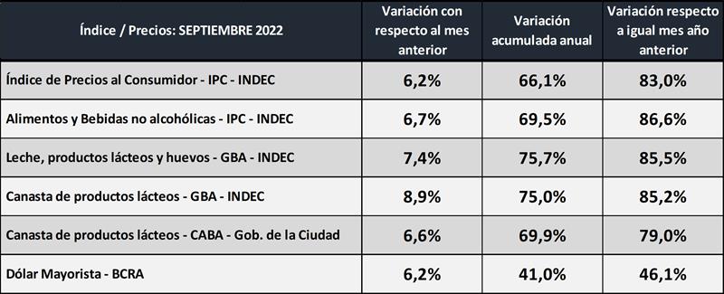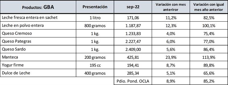 Según datos publicados por la Dirección General de Estadísticas y Censos - Ministerio de Hacienda del Gobierno de la Ciudad de Buenos Aires, los precios de los productos lácteos de esta canasta, tuvieron un crecimiento mensual promedio ponderado del 6,6%, en el período enero-septiembre del 69,9%, e interanual del 79,0%. El ponderado es elaborado por OCLA sobre el mismo criterio mencionado para la canasta GBA de INDEC.