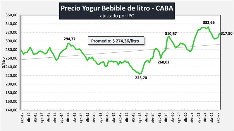 La situación de los yogures bebibles de litro es diferente, sostienen el nivel de consumo de la categoría, sus precios se ajustaron con el ritmo inflacionario, frenándose en los últimos dos meses de 2021, cayendo en enero de 2022, recuperando un 1,3% en febrero último y cayendo desde marzo a junio y con leve recuperación entre julio y septiembre. Lamentablemente tiran para abajo el promedio del mix, ya que su aumento de ventas no fue acompañado por las ventas de yogures en pote, postres y flanes que tienen un mayor valor por litro equivalente.