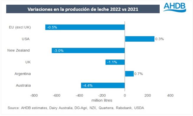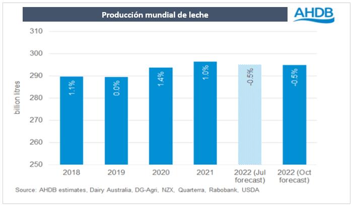 Se espera que la producción mundial de leche caiga un 0,5 % en 2022 en las principales regiones productoras, según las últimas previsiones. Esto está en línea con las expectativas de principios de año, aunque ha habido cambios en las perspectivas individuales.