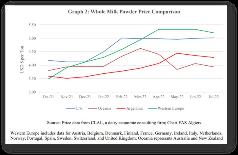 El siguiente gráfico ilustra las tendencias de precios de varios de los principales exportadores de leche entera en polvo a Argelia. Tenga en cuenta que los precios de la leche en polvo entera de Argentina y Oceanía (Australia y Nueva Zelanda) se han mantenido constantemente más bajos en comparación con los precios de la leche en polvo entera de EE. UU. y la UE.