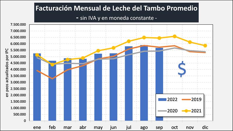 El aumento interanual de la producción del período enero-septiembre del tambo promedio en 2022 fue del 0,2% que contrapuesto con una baja en moneda constante del precio del 4,1%, representó una disminución del 3,9% en la facturación total del período