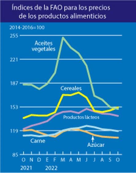 El índice de precios de los productos lácteos de la FAO registró en octubre un promedio de 140,1 puntos, esto es, 2,5 puntos (un 1,7 %) menos que en septiembre, lo que, si bien representa el cuarto descenso mensual consecutivo, se mantuvo con todo 18,7 puntos (un 15,4 %) por encima de su valor de hace un año. En octubre disminuyeron los precios internacionales de todos los productos lácteos que componen el índice. Las compras de China, inferiores a lo previsto, y la débil demanda de suministros al contado, ya que la mayoría de los países importadores tenían bien cubiertas sus necesidades inmediatas, junto con el efecto de la debilidad del euro frente al dólar de los EE.UU., explican la caída de los precios mundiales de los productos lácteos. La incertidumbre en los mercados acerca de la dirección de la demanda de productos lácteos, a raíz de la vertiginosa inflación y las recesiones económicas, también presionó a la baja los precios internacionales de los productos lácteos. No obstante, aumentó la demanda de algunos productos lácteos en otros países de Asia, lo que contuvo un descenso posiblemente mayor de los precios de los productos lácteos.