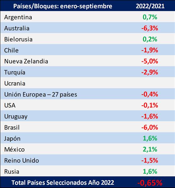 Evolución de la producción mundial de leche 17/11/2022En el cuadro siguiente se toma un grupo seleccionado de los principales países productores e importadores que representan alrededor del 60% de la producción mundial de leche de vaca, en el cual se puede observar una caída de la producción del 0,65%, para el período enero-septiembre de 2022 respecto a igual período del año anterior. ![]() La Unión Europea, que presentó valores negativos para el año 2021 y comenzó de igual forma el 2022, revirtió en febrero la tendencia, pero vuelve a descender en marzo-julio, recuperando algo en el último bimestre. A diferencia de Europa, Estados Unidos que tuvo valores positivos en 2021, en 2022 presenta un ratio negativo para los nueve primeros meses de 2022. Los valores negativos de Estados Unidos y de la Unión Europea, que por su representatividad en el volumen total definen el número global, son ahora acompañados por varios países que también presentan porcentajes de variación interanual negativa. Argentina, comienza el año como la mayoría de los países lecheros con una caída (0,9%) que se revirtió en febrero-abril, pero entre mayo y julio ya se da un crecimiento decreciente y acumula en lo que va del año un +0,7%, que de no mejorar las condiciones climáticas y con la suba de costos de alimentación, puede tornarse negativo hacia finales del año. Cabe recordar que Argentina fue quien presentó las mayores tasas de crecimiento en 2020 y 2021 (7,4% y 4,0% respectivamente). Y en 2022 es el único país del grupo de los principales exportadores mundiales (USA, UE-27, Australia, Nueva Zelanda y Uruguay), que presenta crecimiento de la producción. ![]() análisis elaborado por el OCLA en base a información de www.clal.it