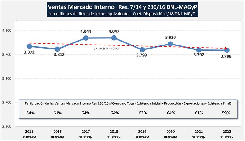 En el gráfico siguiente se puede ver la evolución de las ventas que captura la resolución, medida en litros de leche equivalente y el porcentaje que esas ventas representan del total de leche consumo en el mercado interno según el Balance Lácteo, quedando fuera de análisis alrededor del 40% de las ventas de productos lácteos en el mercado doméstico.