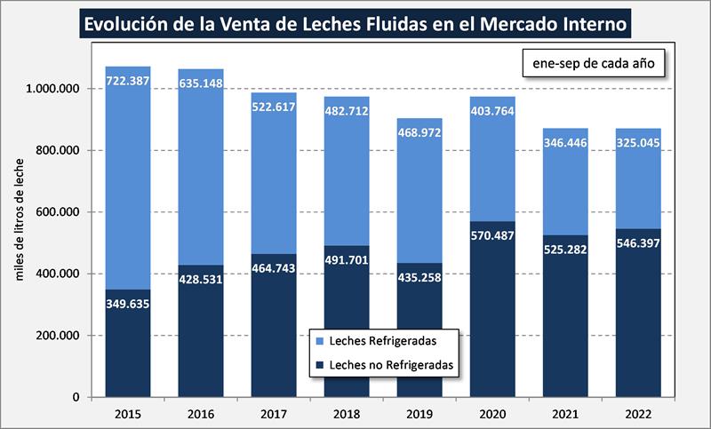 En los dos gráficos siguientes se presentan las ventas (en miles de litros) de enero-septiembre de cada año de leche fluida (refrigeradas y no refrigeradas), donde se puede ver por un lado el descenso generalizado en la venta de leches fluidas (al menos las que captura la Resolución 230) y cómo van creciendo en participación las leches no refrigeradas en detrimento de las leches refrigeradas.