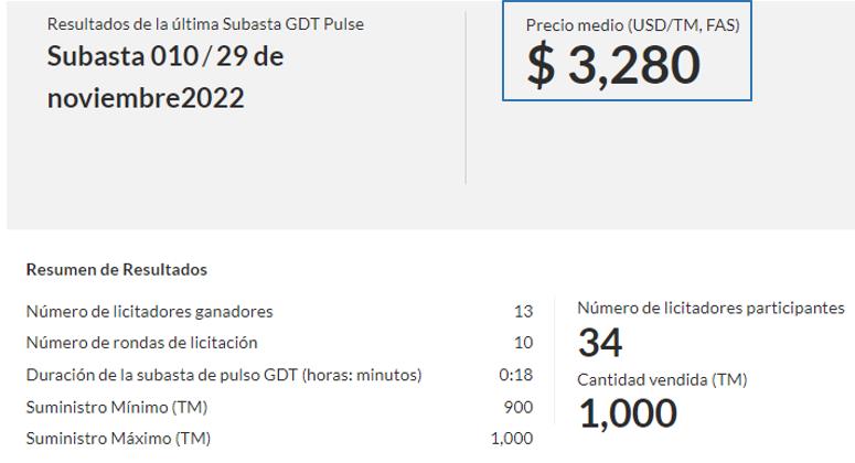 La Subasta Nº 010 se ha llevado ha cabo en el día de hoy, martes 29 de noviembre, donde el precio promedio obtenido para la LPE ha sido de 3.280 US$/t , lo que implica una baja de 0,8% respecto a lo publicado en la última GDT pulse (3.305 US$/t) y una baja de 3,4% respecto al último evento del GDT de hace una semana (3.397 US$/t).